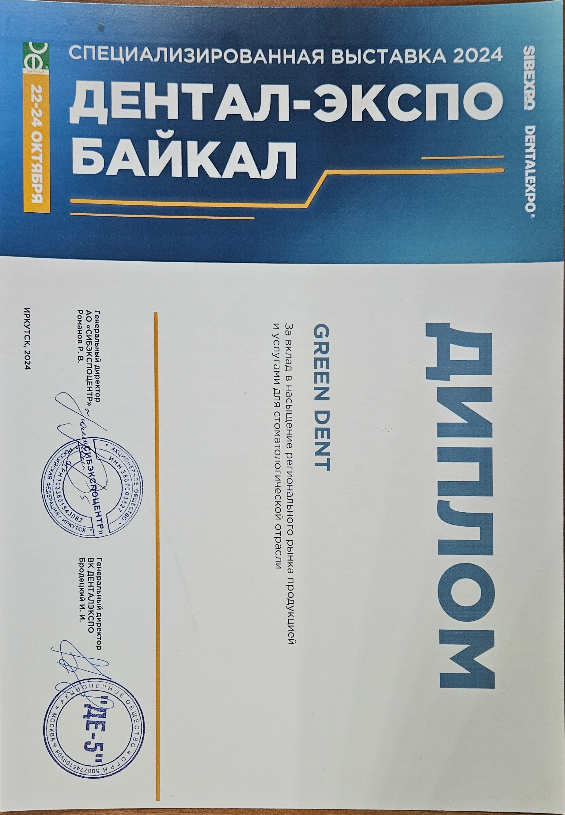 Диплом GREEN DENT за активное участие в «Сибирском стоматологическом форуме» и специализированной выставке «Дентал-Экспо Красноярск»